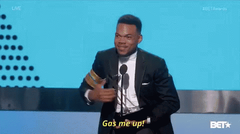 Chance The Rapper on stage at the BET Awards, enthusiastically exclaiming 'Gas me up!' into the microphone.
