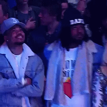 Chance The Rapper reacts with an embarrassed smile, looking up then bowing his head, possibly during the National Anthem.
