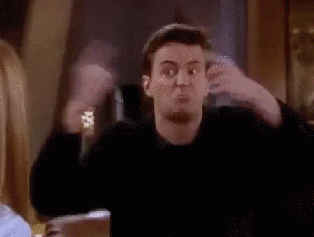 Chandler Bing from Friends makes a funny face and exaggerated hand gestures, appearing to be drunk.