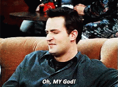 Chandler Bing from Friends reacts with an emphatic 'Oh, MY God!' while sitting on a couch.