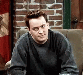 Chandler from Friends makes a characteristic wry face while sitting on a couch.