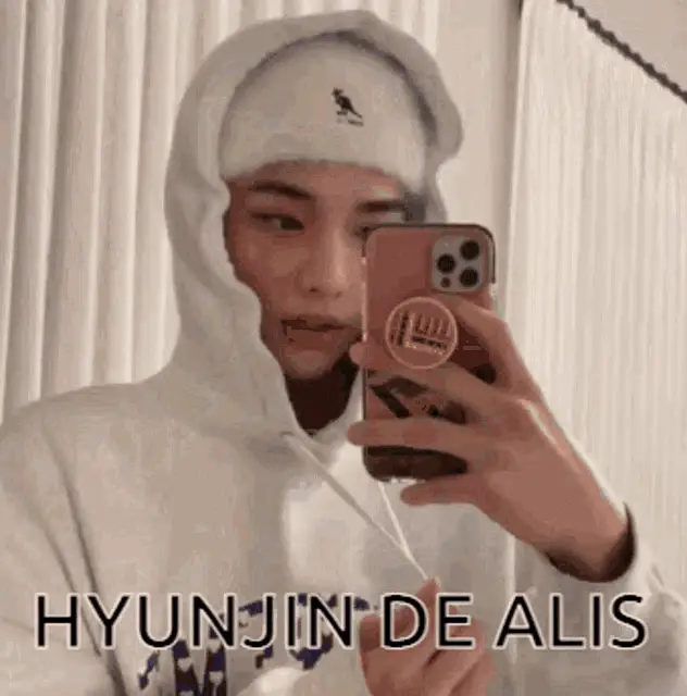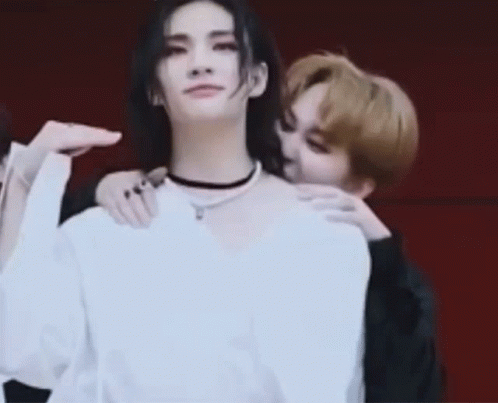 Stray Kids' Hyunjin and Changbin share a playful moment, with Changbin appearing to 'bite' Hyunjin's neck.