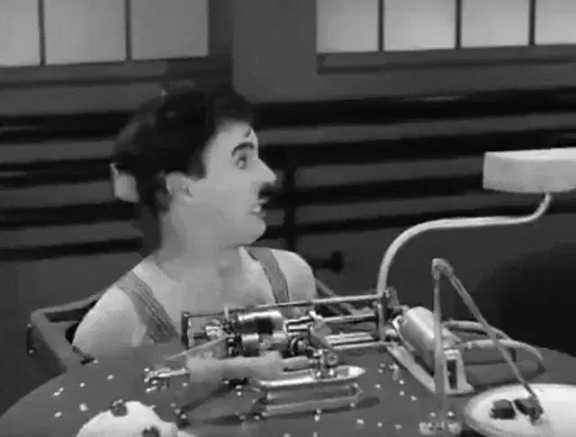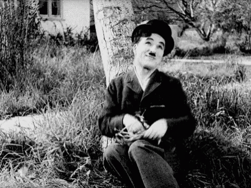Charlie Chaplin as The Tramp, sitting under a tree in a field, looking up with a hopeful expression.