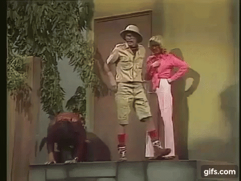 Chapolin Colorado, played by Roberto Gómez Bolaños, appears in a jungle sketch with other characters.