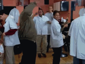 Comedian Dave Chappelle shows off his robot dance moves in a lively indoor setting.
