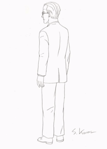 A black and white drawing of Charles Foster Offdensen from Metalocalypse in a suit.