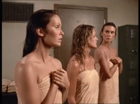 Three Charlie's Angels characters, wet and wrapped in towels, stand together in a locker room.