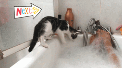 A curious black and white cat takes an unexpected dip in a bubbly bathtub, then climbs out wet.