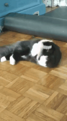 Black and white cat playfully rolls on a wooden floor, cuddling and batting at a white toy.