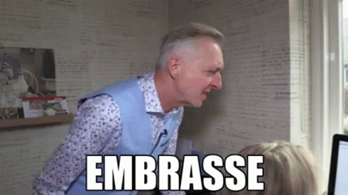 Martien Meiland from Chateau Meiland makes a funny face while leaning towards a woman, with 'EMBRASSE' on screen.