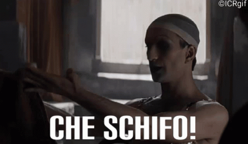 Character from Il Commissario Ricciardi, possibly Bambinella, exclaims 'Che Schifo!' with a disgusted expression.