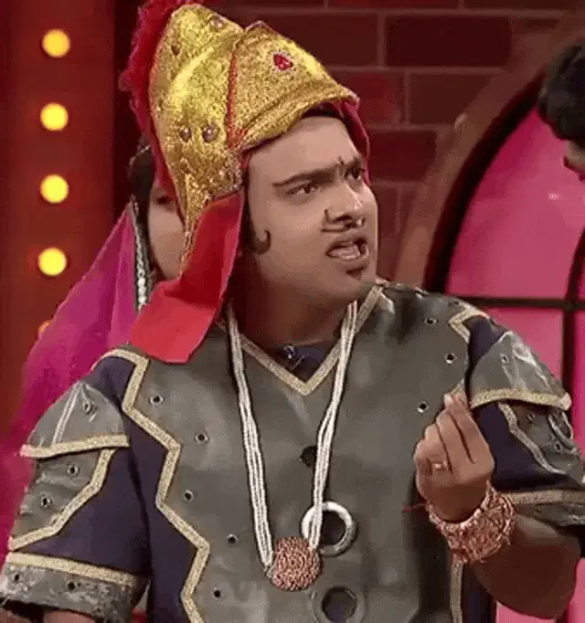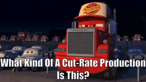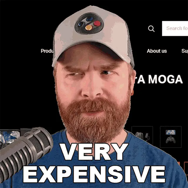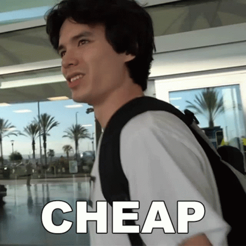 A man with a backpack reacts to a sign displaying the word "CHEAP" in an outdoor setting with palm trees.