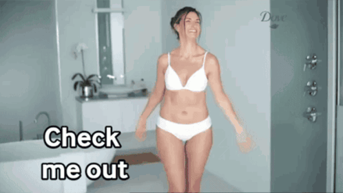 A mid-adult woman in white lingerie poses in a bathroom with the text 'Check me out' displayed.
