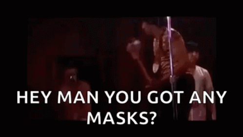 Cheech Marin in a pink tank top with a guitar asks, 'Hey man, you got any masks?' during a Cheech and Chong performance.