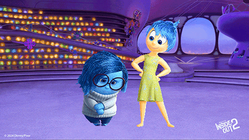 Joy from Inside Out 2 attempts to cheer up a gloomy Sadness with funny antics, but Sadness remains sad.