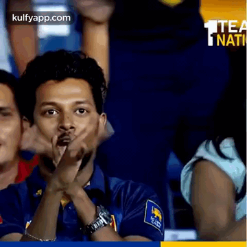 A Sri Lankan cricket fan passionately cheering and expressing excitement with hand gestures in the stands.