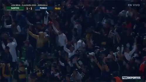 Pumas fans enthusiastically cheering during a Liga MX match against Santos, with the score 1-1, broadcast on Fox Deportes.