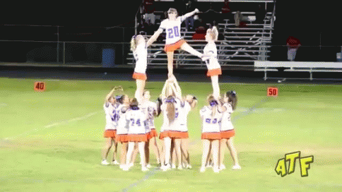 Cheerleaders perform a pyramid stunt on a football field, but one falls during the routine.