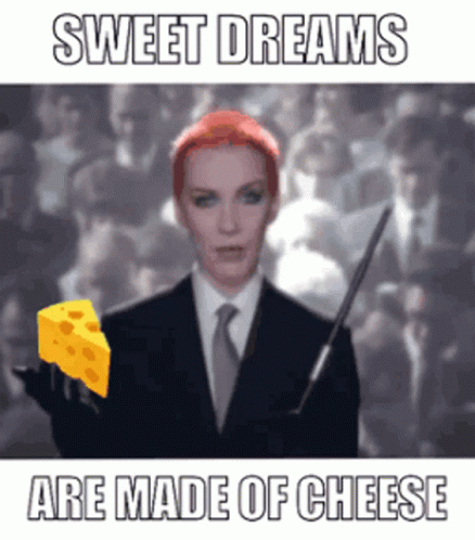 Annie Lennox in her iconic suit and tie, holding a piece of cheese, with the meme "Sweet Dreams Are Made of Cheese."