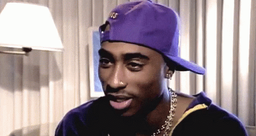 Tupac Shakur smiles broadly, wearing a purple cap backward and a gold chain.