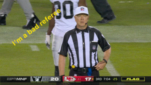 NFL referee Cheffers makes a call on the field, with on-screen text humorously declaring him a 'bad referee'.