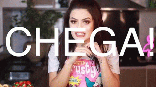 Kim Rosa Cuca emphatically declares 'Chega!' or 'That's Enough!' in a direct address to the camera.