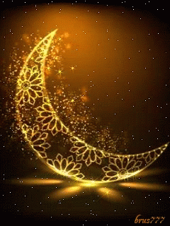 A beautifully animated, glowing crescent moon adorned with intricate floral patterns, surrounded by sparkling stars, by Cheikh Hamza Gasba.