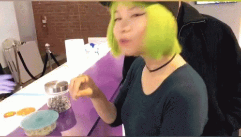 Goldie Chan with vibrant green hair, eating and saying 'Chewy' in front of a purple counter.