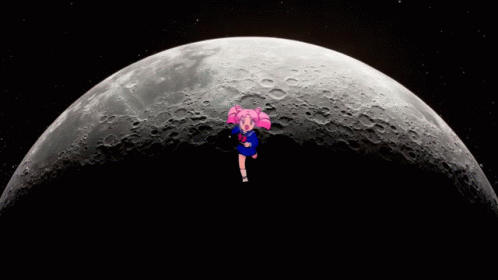 Chibiusa running across the moon with Luna P, as the sun rises in the background.