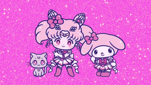 Chibiusa Rini, My Melody, and Diana in adorable chibi Sailor Moon-inspired outfits on a sparkling pink background.
