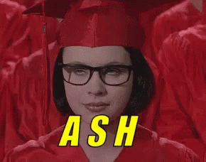 Ash, a nerdy girl in graduation attire, rolls her eyes with a bored expression, with her name displayed.