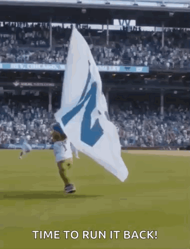 Clark the Cub runs with the Chicago Cubs W Flag on the baseball field, with 'TIME TO RUN IT BACK!' displayed.