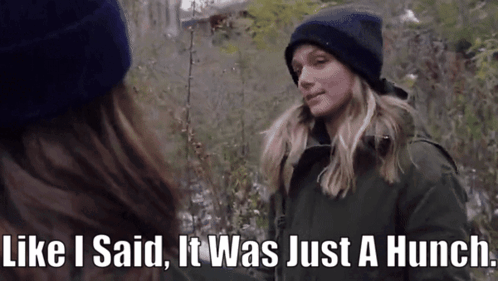 two women are standing next to each other in the woods and one of them is saying like i said it was just a hunch