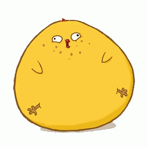 A round, yellow cartoon chick named Pio with a surprised expression, small eyes, and a red beak.