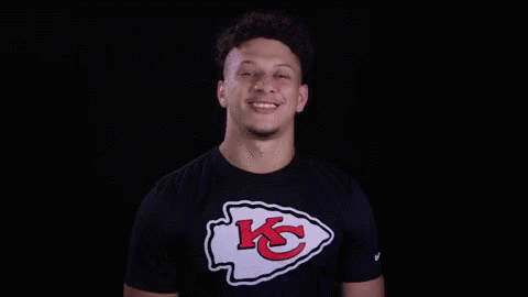 A man wearing a black t-shirt with the Kansas City Chiefs logo smiles, showing team pride.