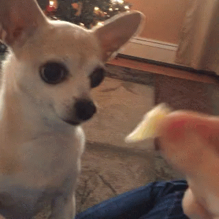 A small chihuahua eagerly takes food from a person's fingers, looking up with wide eyes.