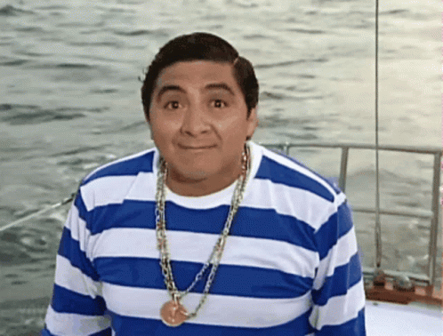 Carlos Bonavides as Huicho Domínguez on a boat, giving an expressive 'Chile' reaction with a smile and raised fist.