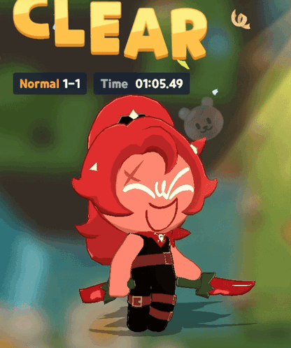 Chili Pepper Cookie celebrates clearing a level in Cookie Run: Tower of Adventures with a clear screen and time.