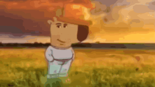 A chill cartoon capybara character stands calmly in a field with a beautiful sunset backdrop.
