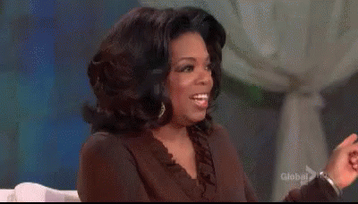 Oprah Winfrey reacts with 'Ok' and 'Thank you so much' while sitting on a couch.