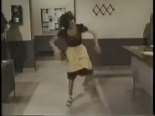 Chimoltrufia dances energetically in a hallway, wearing her signature yellow apron.