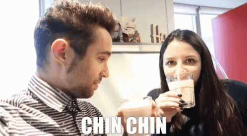 Natalia and Victoria toast with drinks, saying 'Chin Chin' before taking a sip from their glasses.