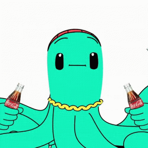 Cartoon octopus character, Chin Chin Grafitero, holding and toasting with Coca-Cola Zero Sugar bottles.