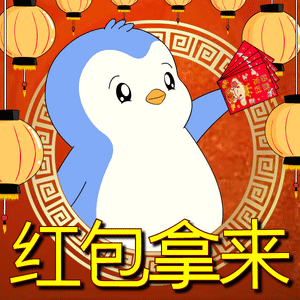 a penguin is holding a stack of red envelopes in front of lanterns