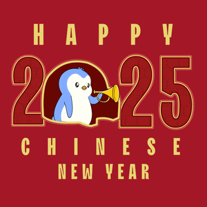 Happy Chinese New Year 2025 greeting card featuring a cute Pudgy Penguin playing a trumpet.