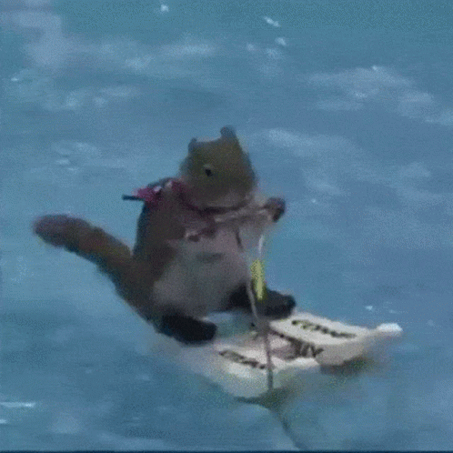 A cute chipmunk skillfully water skiing across a blue body of water, holding onto a tow rope.