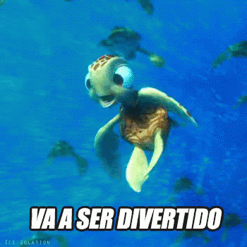 Chiqui the sea turtle from Finding Nemo swims happily, exclaiming 'It's going to be fun!'