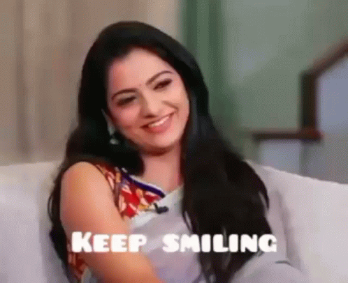 Chithu Vj smiling brightly on a couch with the message 'Keep Smiling' overlaid.