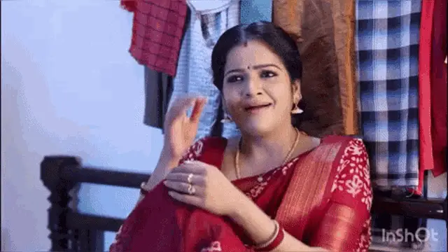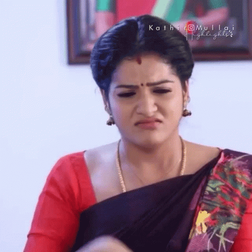 Chithu Vj as Mullai shows a funny pouting expression, wearing a red blouse and purple saree.
