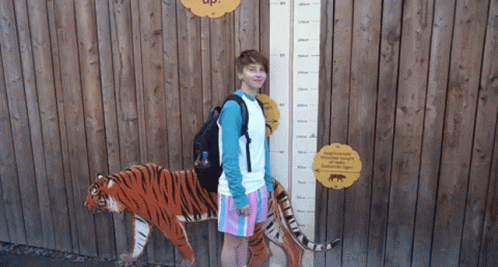 Chloe Donald stands next to a tiger-shaped height chart, measuring herself against the height of a Sumatran tiger.